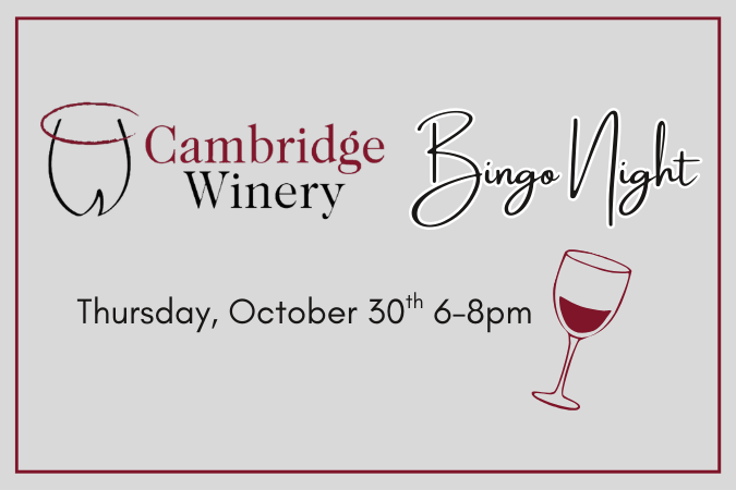 | $10Join us for a fun night of Bingo at Cambridge Winery on Thursday, October 30th, from 6:00–8:00 PM! Enjoy 10 exciting rounds of bingo with chances to win prizes, shelter merchandise, and drink tickets generously donated by Cambridge Winery.